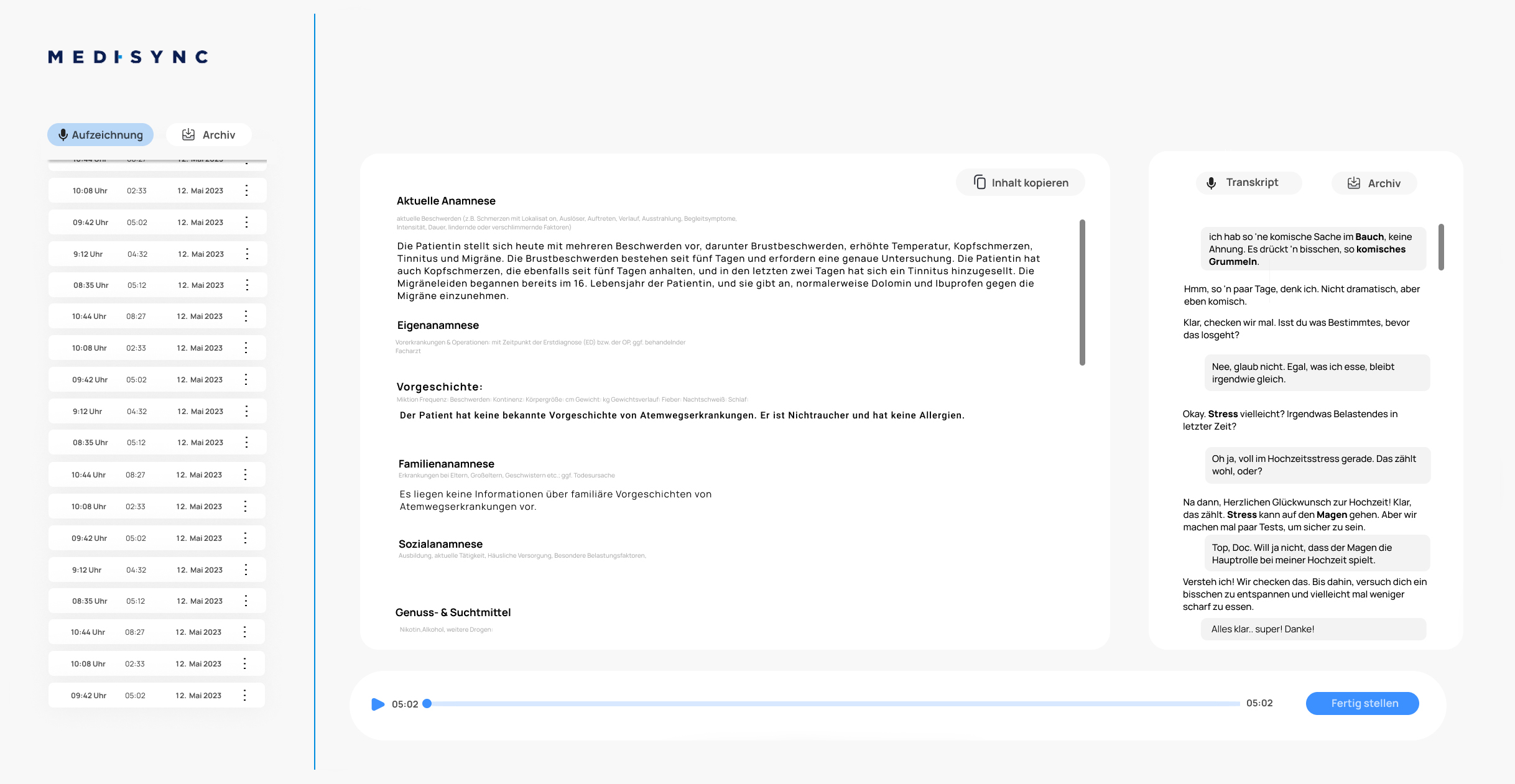 Die Transkriptionsfunktion wandelt mühelos gesprochene Patienteninformationen in Text um, ermöglicht effiziente Dateneingabe und spart wertvolle Zeit beim Patiententermin.